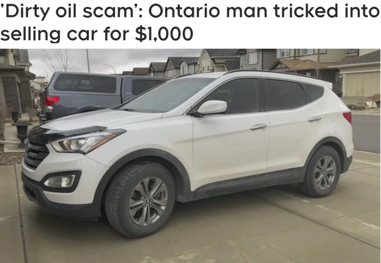 这种骗局被称为“dirty oil scam”。诈骗者会向发动机舱喷洒机油、往排气管里倒油,甚至可能把脏机油倒进冷却液储液罐中。