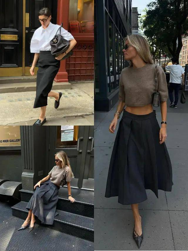 穿衣之道贵在松弛有度,普通大众身材不必强求贴身紧绷的衣服款式,胯宽腿粗便选择一条直筒半身裙,或是像上面这条灰色的压褶伞状款式半身裙,遮肉显瘦,自在又得体。