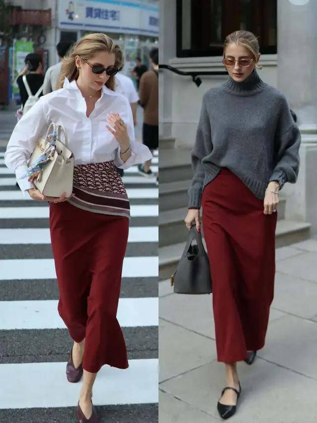 或是换成一件灰色针织衫,搭配上红色的直筒半身裙,脚踩一双黑色的浅口单鞋,灰色、红色、黑色三色相融,沉稳大气,休闲又有活力,随性中透着清爽,日常出街轻松又耐看。