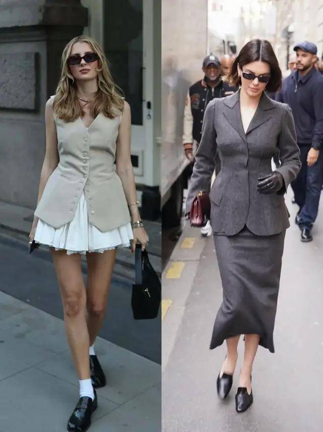 当我们选择一套灰色的西服裙装,搭配上黑色的浅口单鞋,极简利落,优雅大方。