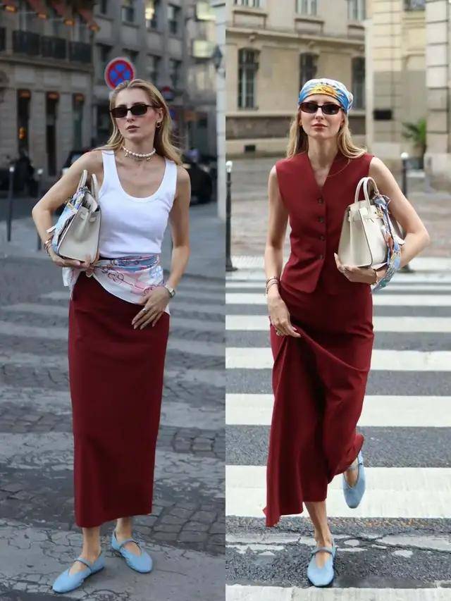 高级感不止在衣服版型与面料上下功夫,更藏在色彩的默契里,一身红色调马甲裙,配上一双雾霾蓝的玛丽珍鞋,冷暖色调组合,温柔又协调。