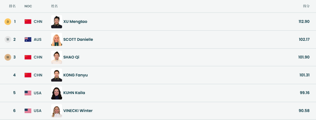 徐梦桃112.90分夺得金牌,邵琪101.90分获得铜牌,孔凡钰101.31分排名第4。