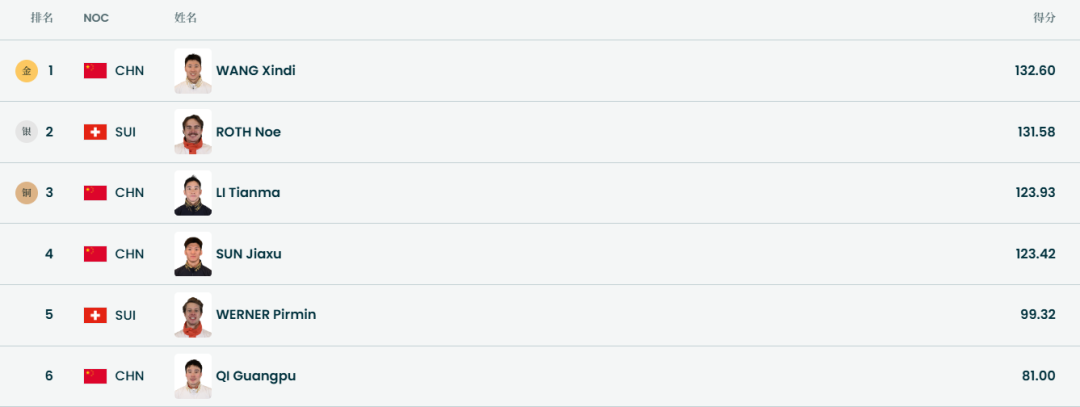 王心迪132.60分夺得金牌,李天马123.93分获得铜牌,孙佳旭123.42分排名第4,齐广璞81.00分排名第6。