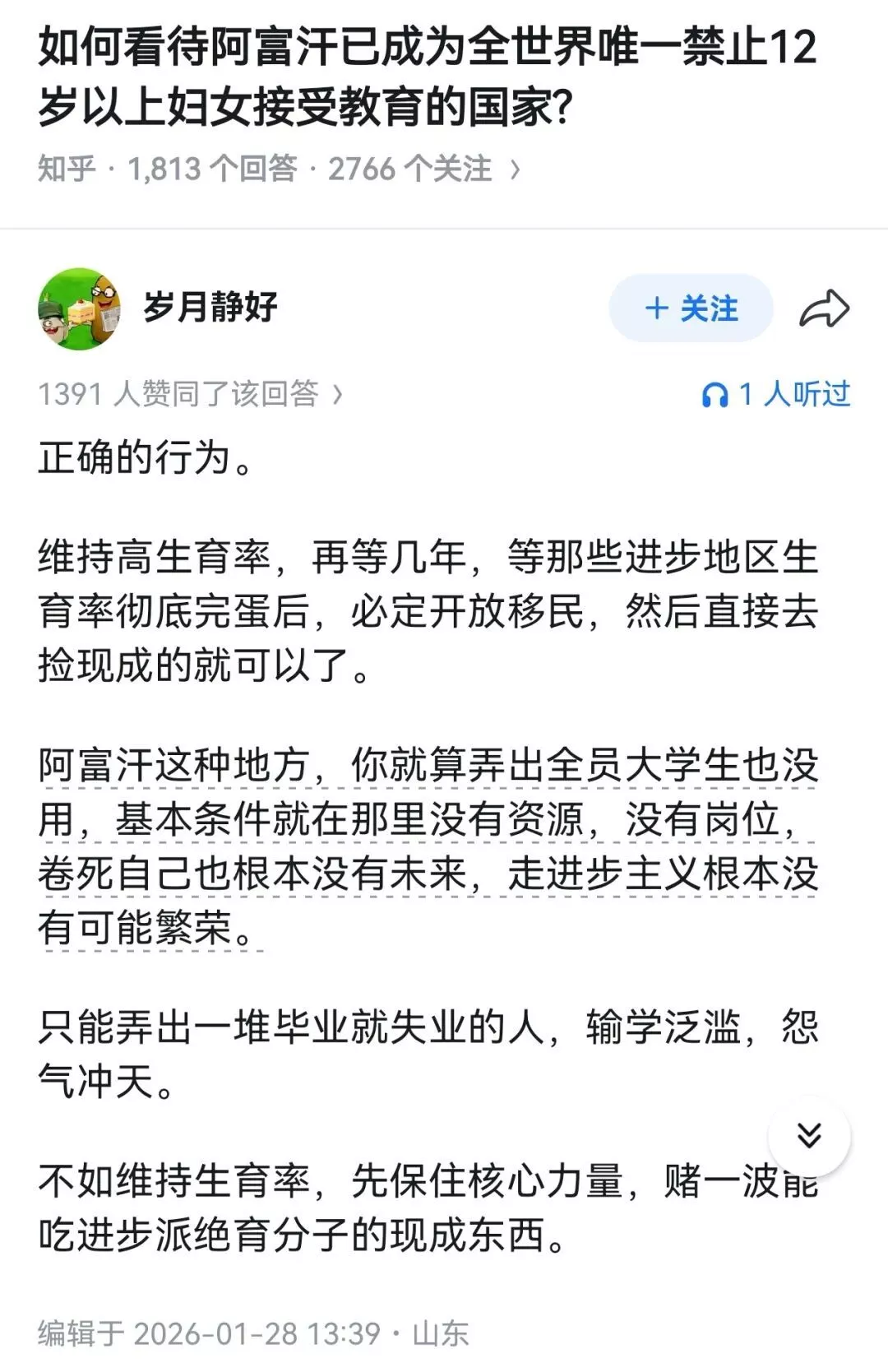 强烈推荐支持男权的都去阿富汗享受男权世界,支持女权的都去北欧体验(相对而言的)女权世界。各得其所。我们女权主义者绝对不会排斥去冰岛,也希望这些极端br⭕也能身体力行前往阿富汗朝圣,不要搞什么叶公好龙哦~