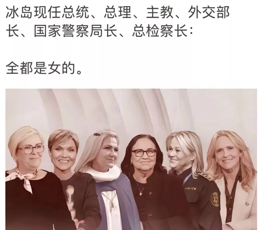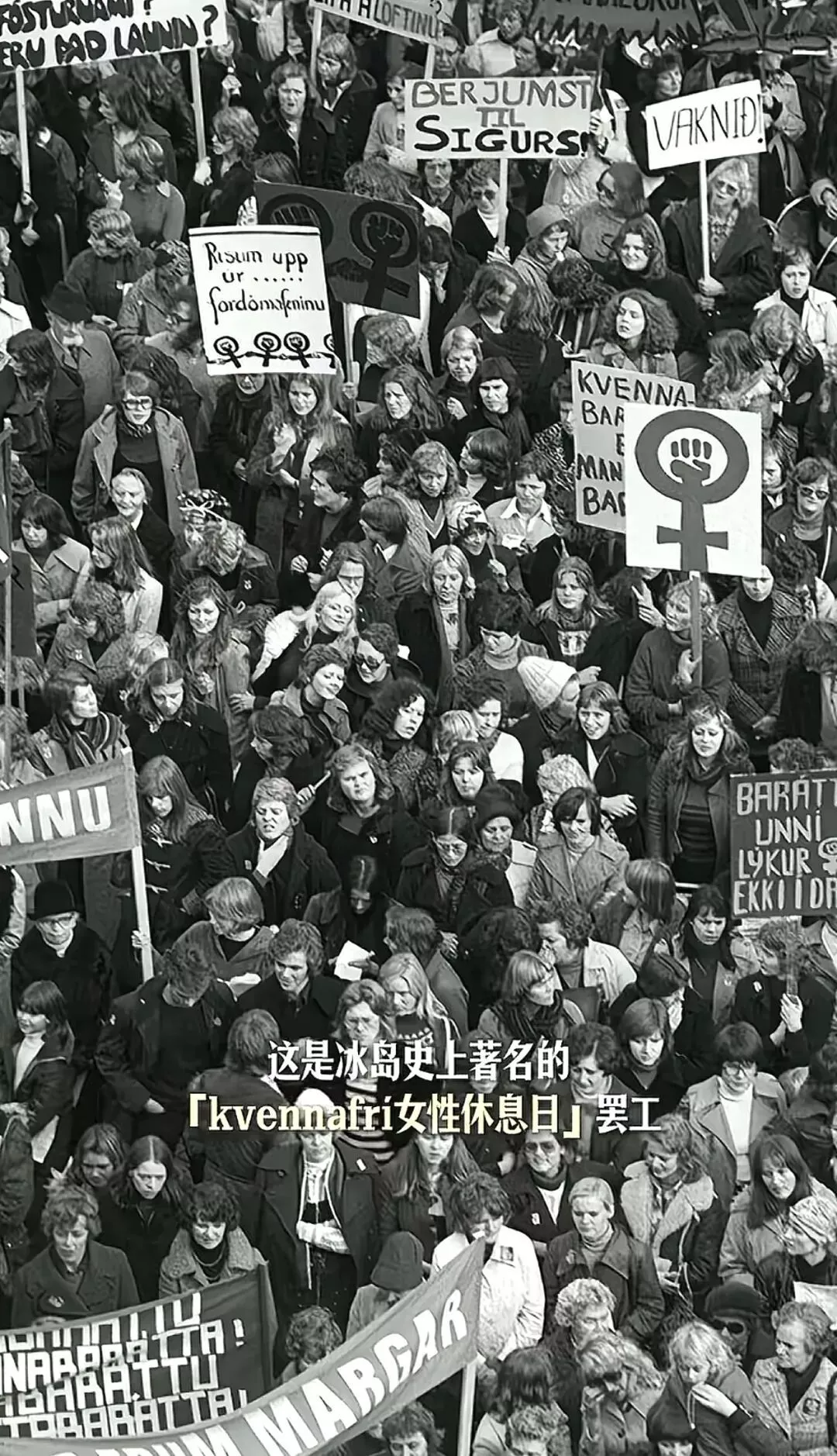 哪怕是当前世界上性别平等程度最高,女权主义走在最前列的冰岛,一直到二十世纪中叶,冰岛的女性权益依然是糟糕而落后的,和世界上其余国家没什么差别。1975年10月24日,冰岛女性掀起了一场核爆式的罢工,工厂停产,学校停课,银行关门,广播和新闻系统瘫痪。全冰岛约有90%的女性参与了这次罢工,证明了“如果女性停止工作,世界就会停止运转”。此后,这样的罢工被称为“休息日”,成为了属于冰岛女性的集体记忆,也深刻地影响了整个世界,至今已经进行过七次。一年后,冰岛出台了性别平等法案。五年后,世界上第一位女总统在冰岛诞生。四十年后,冰岛率先实现了全女政府: