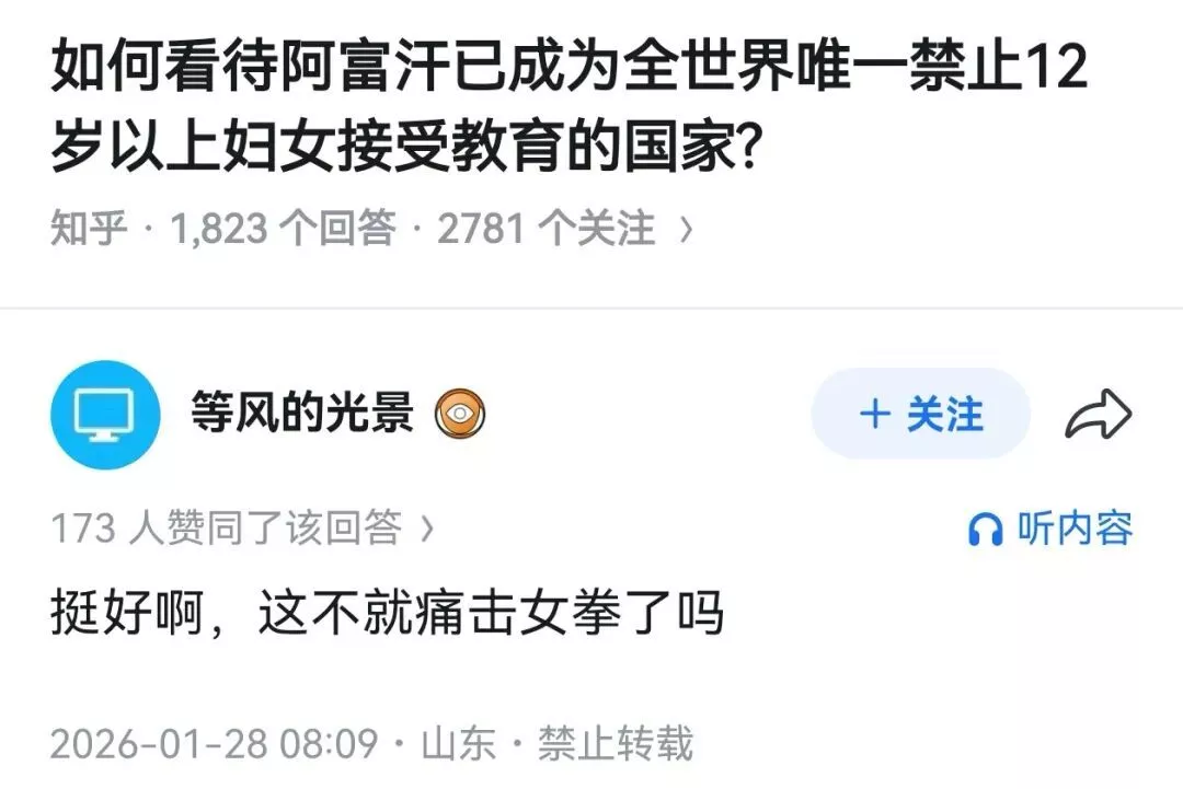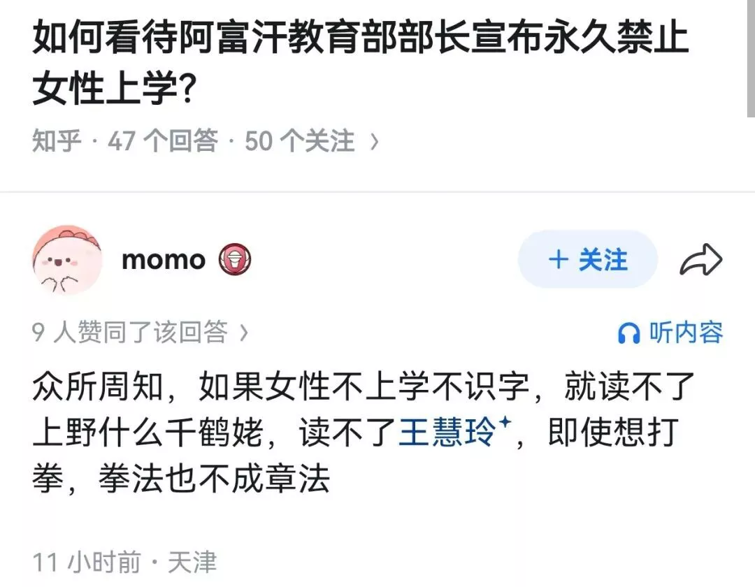 此前,据各大媒体报道,阿富汗宣布“永久禁止阿富汗女性上学”。