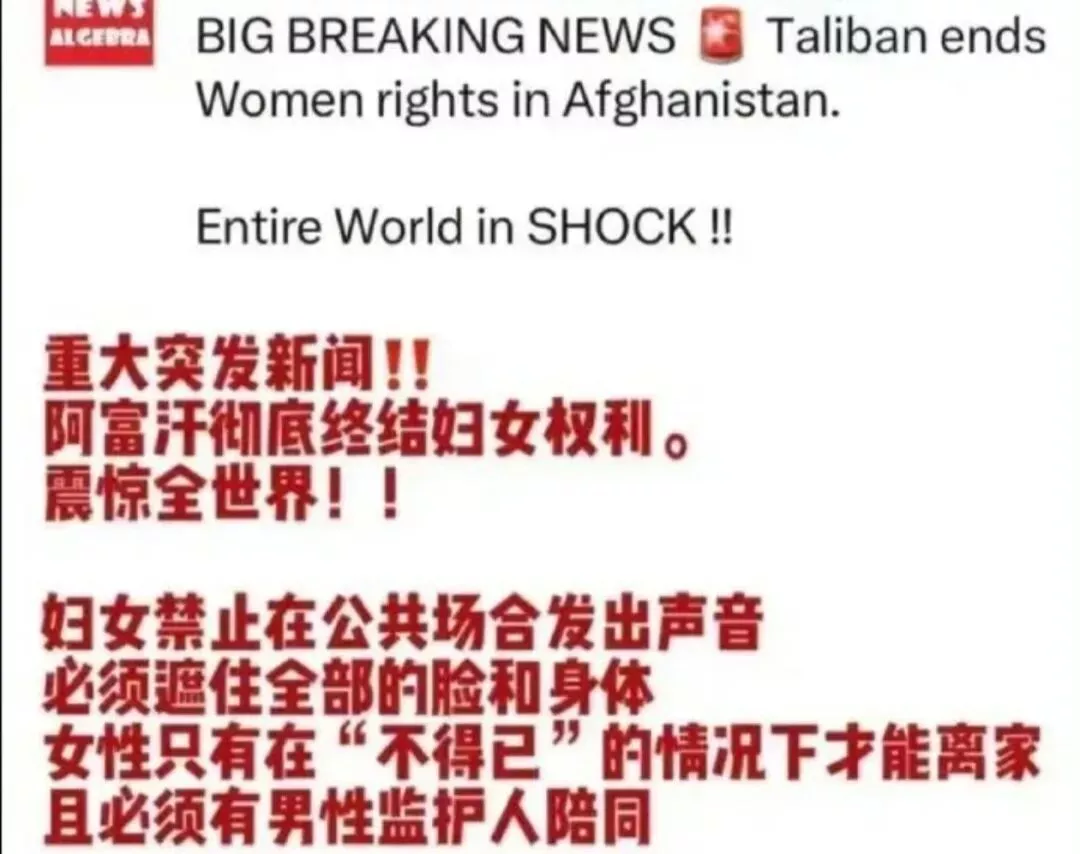 当然,也有“辟谣”,称这段视频是2024年的内容。或许视频是假的,但新闻内容是真的——据联合国教科文组织,阿富汗是当前全球唯一全面禁止女性接受中学及高等教育的国家,并且对女性权利的侵犯与践踏日益猖獗。
