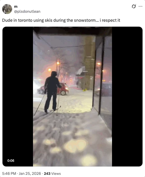 和1月16日那场大暴雪类似,这次也有人直接把越野滑雪板拿出来,在人行道和自行车道上“通勤”。面对交通停摆、路况混乱,一些居民干脆踩着雪板出行,主打一个“我不堵车”。