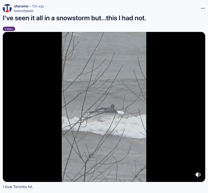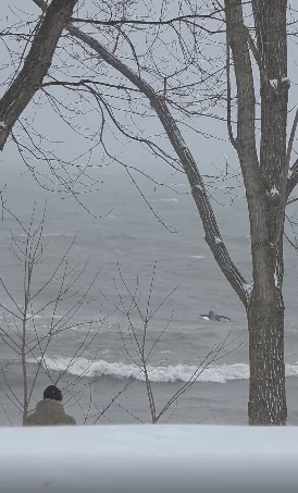 有人目击,在昨天漫天的狂烈大雪中,有人在安大略湖里冲浪!