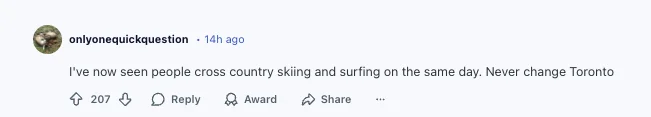 我今天算是见识全了:同一天,有人在多伦多越野滑雪,还有人在湖里冲浪。多伦多,永远别变。