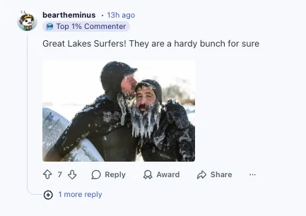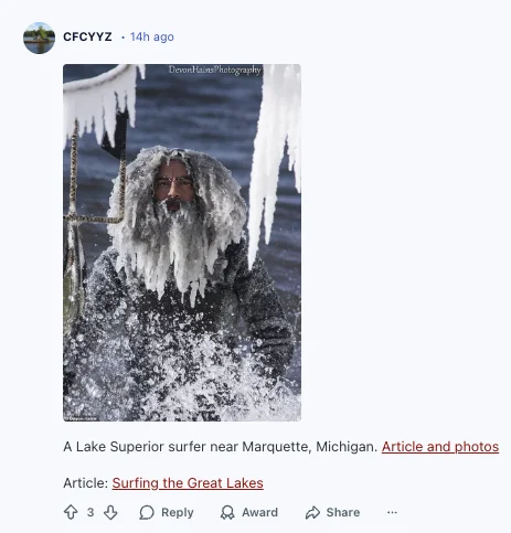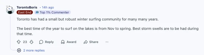 “多伦多其实已经有一个规模不大、但非常硬核的冬季湖浪冲浪社群很多很多年了。每年在五大湖冲浪的最佳季节是从11月一直到春天,而最好的浪,往往就出现在这段时间的暴风天气里。”