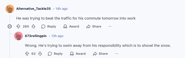“不对。他是在逃避自己真正的责任——那就是回家铲雪。”
