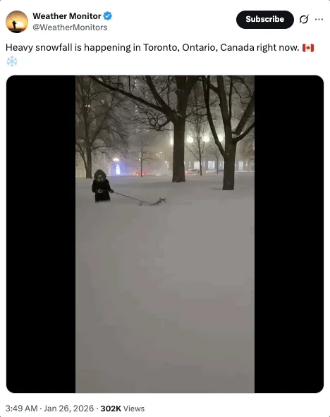 这场历史级暴风雪也成为自1937年开始记录以来,多伦多单次降雪量最大的一次降雪事件。加拿大环境部(Environment Canada)数据显示,截至目前,多伦多1月累计降雪已达88.2厘米,同样打破了该市“最雪一月”的历史纪录。