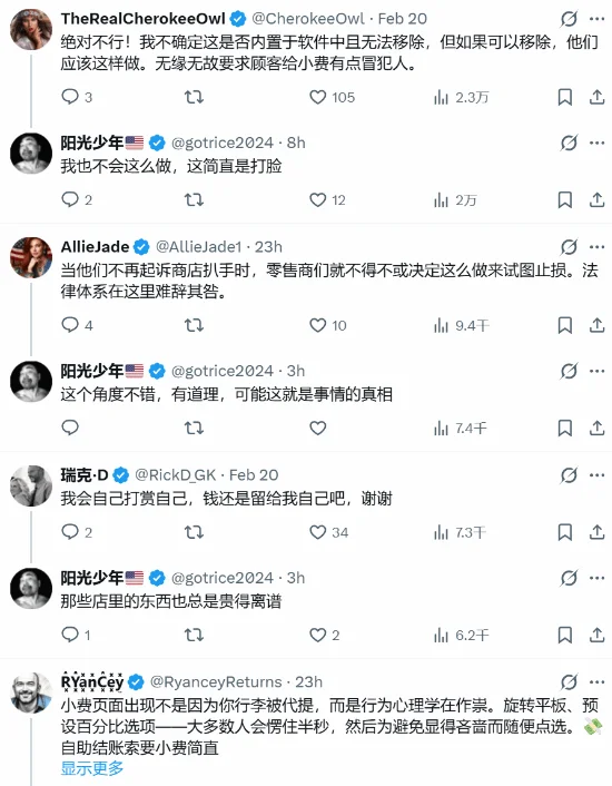 如果所有事情都是你自己完成的,凭什么要求顾客支付小费呢?给小费又到底是给谁呢——给那些负责上货的员工吗?你去普通超市结账时,可从来不会弹出小费提示,那为什么在这里就变得理所应当了?”