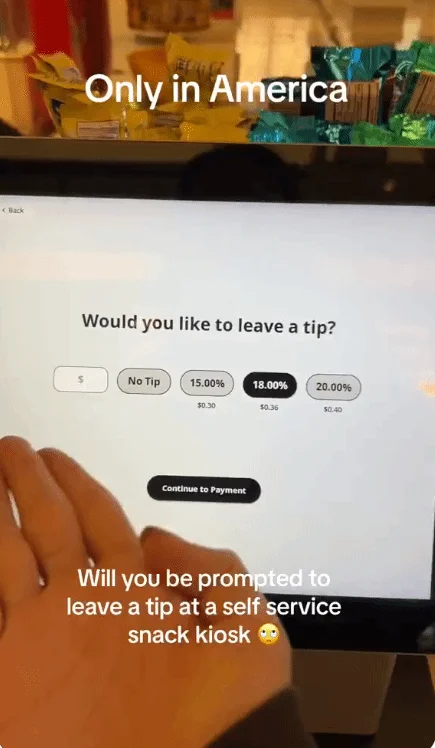 “想象一下,你在一家自助服务商店,自己取货,自己扫描结账,自己付款。当你准备在自助收银台付款时,屏幕上却跳出一个提示,要求你支付小费。