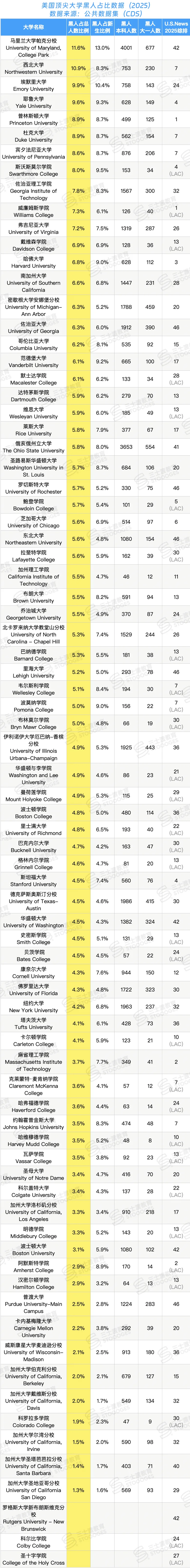 值得注意的是,许多顶尖文理学院,如斯沃斯莫尔学院(8%) 和鲍登学院(5.7%),在吸引黑人学生方面,表现不输甚至超过同级别的综合性大学。