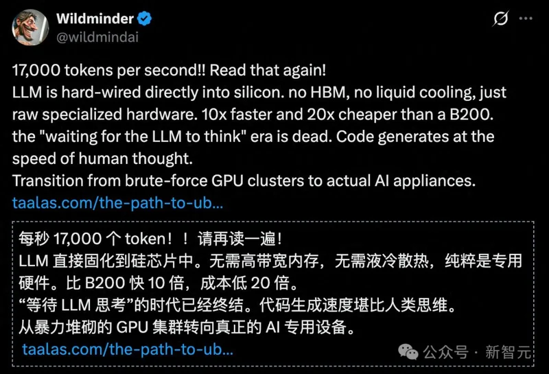 在这个所有科技巨头都在为英伟达的高端GPU抢破头的时代,一家成立不到三年的多伦多小厂Taalas,突然朝着整个行业扔出了一颗反常识的「深水炸弹」:他们抛弃了液冷,抛弃了昂贵的HBM显存,甚至抛弃了「通用计算」,选择了一种最粗暴、最狂野的物理美学:直接把大模型焊死在芯片里!