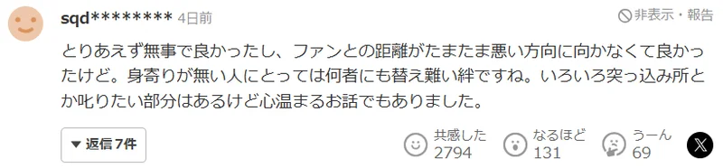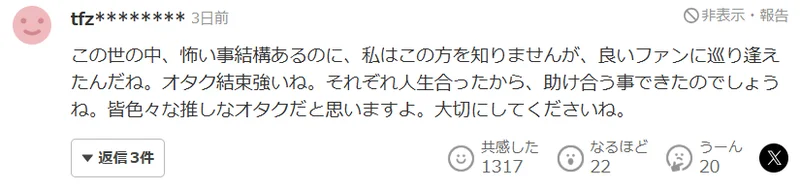 这个世界上明明有那么多可怕的事情,虽然我不认识这位偶像,但她能遇到这样一群善良的粉丝,真是太幸运了。御宅族之间的团结真强大啊!想必正是因为每个人都有自己不同的人生经历,请一定好好珍惜彼此。