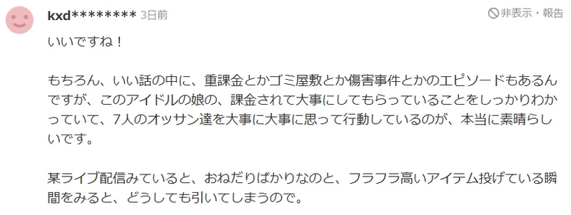 当然,这个温馨故事里也穿插着诸如高额打赏、垃圾屋、伤害事件之类的桥段,但最打动人的,是这位偶像女孩清楚地明白自己正被这七位大叔慷慨支持、真心珍视,并始终怀着感恩之心,发自内心地珍惜他们、为他们奔走行动,这一点真的非常了不起。