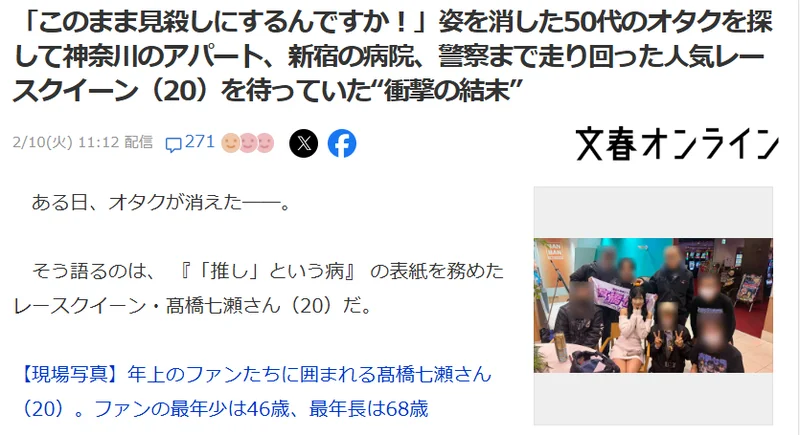事情还得追溯到不久前的某天,高桥妹子与7人组中作为粉丝代表的50多岁A叔,约好一起去录制广播节目。然而到了录制当天,一早到达约定地点的高桥却一直未等到人,A叔的电话始终无人接听、发出去的LINE消息也石沉大海。