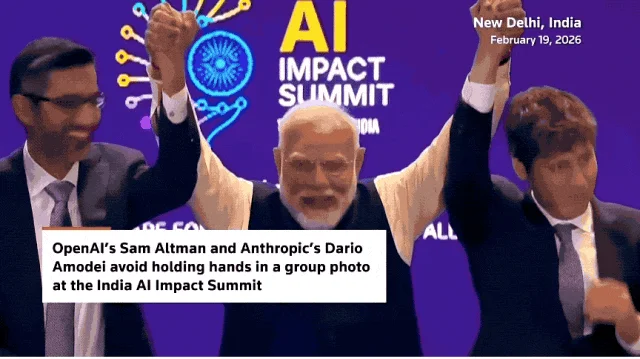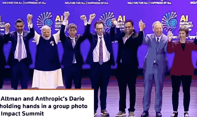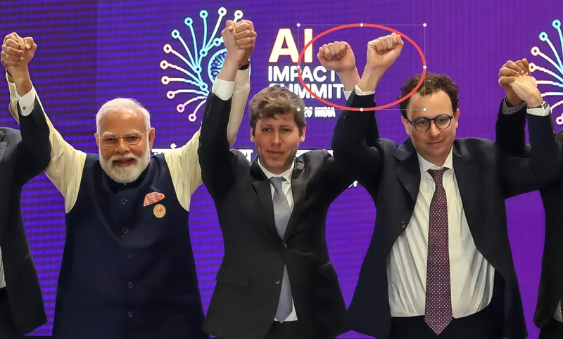 在印度人工智能影响力峰会上,出现 AI 圈最尴尬的一次合影。印度总理莫迪举起 Sam Altman 和 Sundar Pichai 的手,其他大佬也纷纷效仿牵手,唯独 Altman 和 Anthropic CEO Dario Amodei 并肩站立。Altman 先是下意识地往旁边瞟了一眼,眼神里闪过一丝困惑,像是在确认「这家伙怎么站我旁边」。