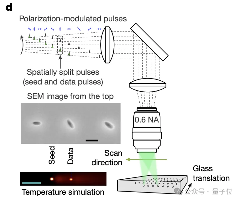 激光在玻璃内部制造出极小的拉长形纳米空洞,空洞的朝向由激光的偏振方向决定。改变偏振方向,就改变了空洞的朝向,相当于写入了不同的符号。论文中使用了8个不同的方位角等级,也就是说一个体素可实现8种状态编码,对应3bit。