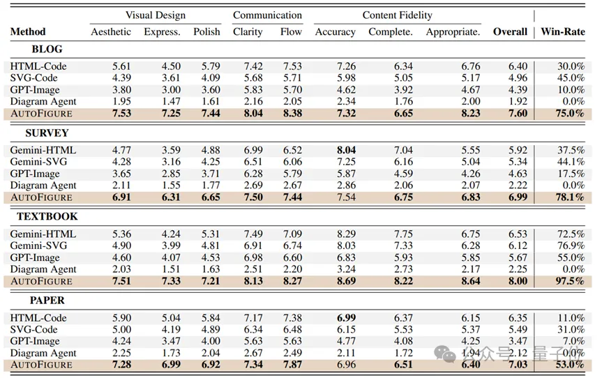 降维打击:在逻辑清晰度和准确度上,AutoFigure的优势极大,在教科书类任务中胜率甚至高达97.5%。