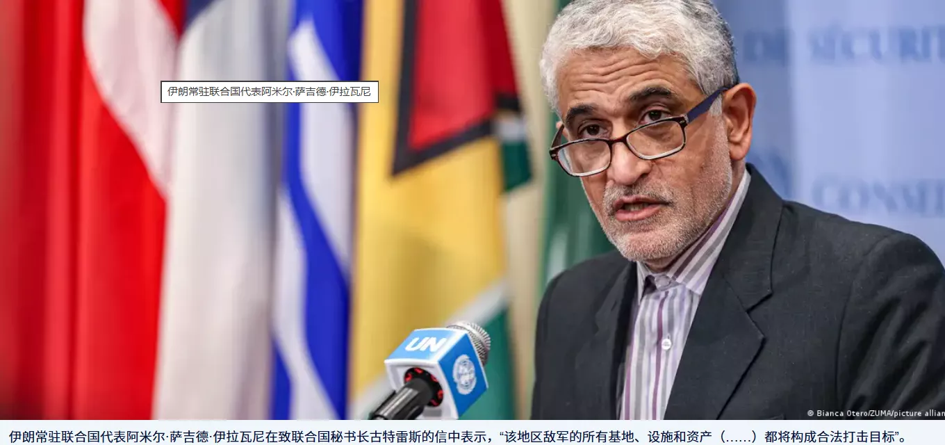 伊朗常驻联合国代表阿米尔·萨吉德·伊拉瓦尼(Amir Sajid Irawani)在致联合国秘书长古特雷斯的信中表示,“该地区敌军的所有基地、设施和资产(……)都将构成合法打击目标”。美军在中东地区设有多个军事基地,驻扎有数万名士兵。
