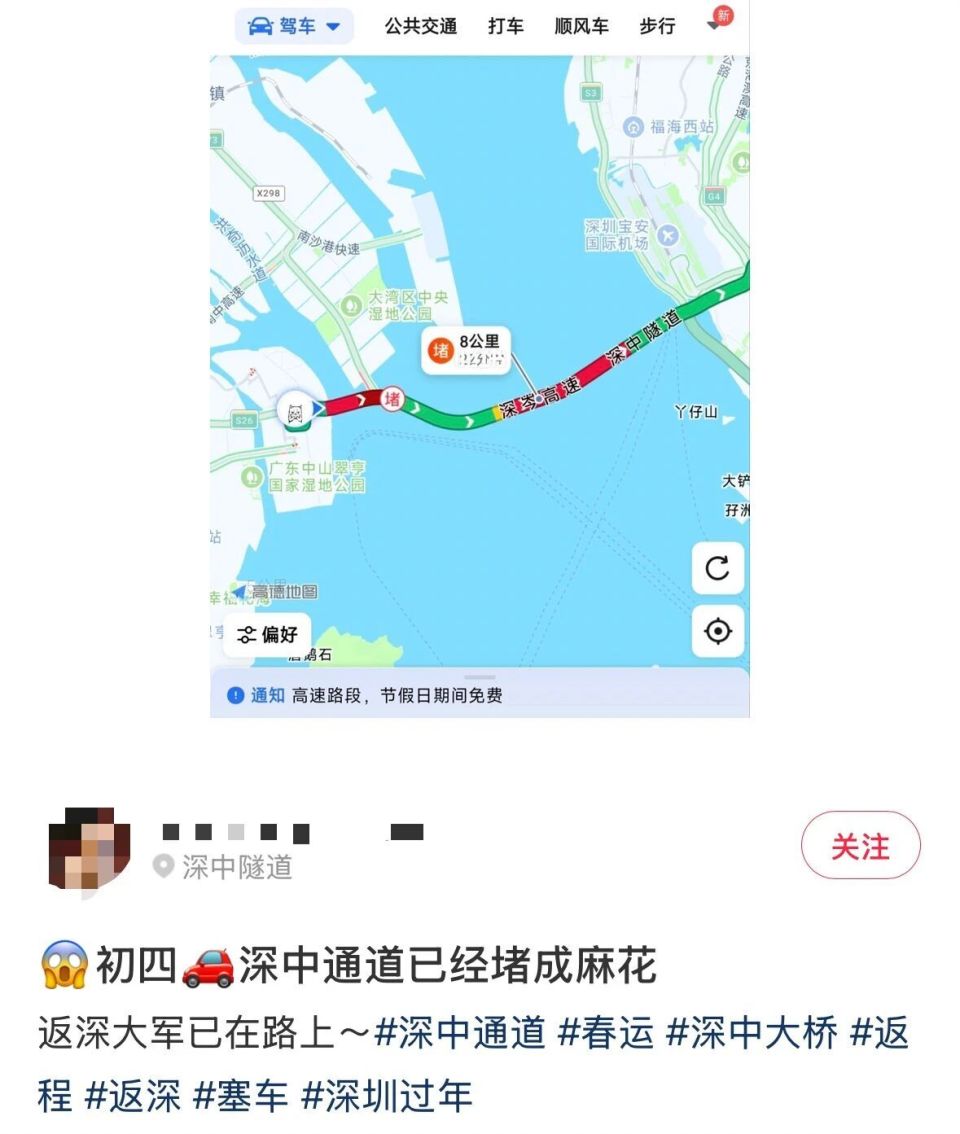 2月22日起至2月26日(正月初六至正月初十),预计深中通道向东行往深圳方向将出现拥堵;深中通道双向隧道口、中山往深圳方向万顷沙互通至西人工岛段在车流高峰期容易出现缓行或拥堵。