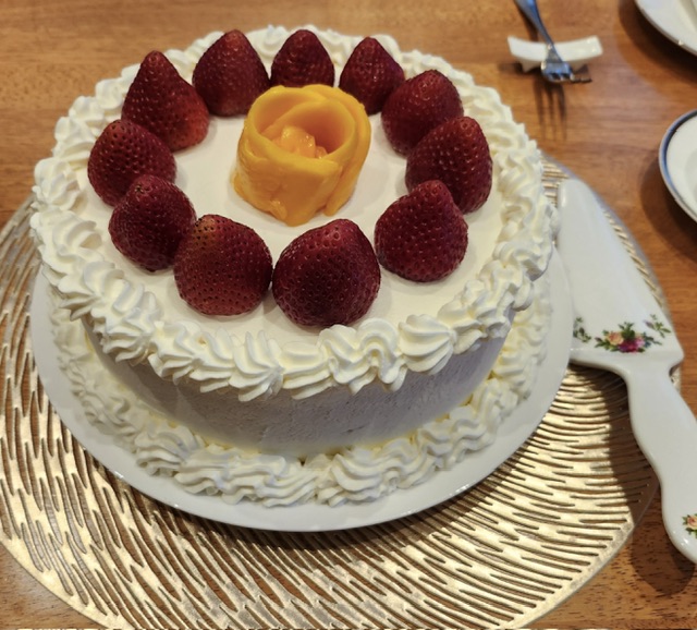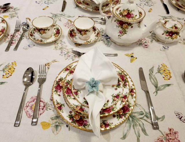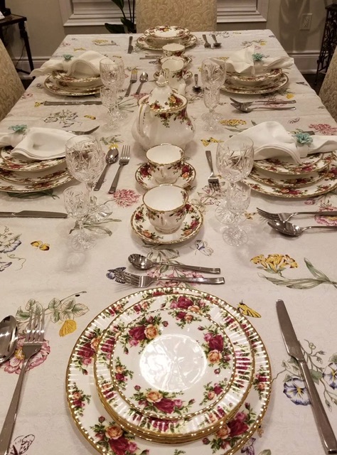 选的餐具是那套 Royal Albert Old Country Roses 的骨瓷。玫瑰描金在灯下安静地闪着光。蜡烛点上,灯光调暖,屋子一下子柔和下来,我也轻轻地松了口气。