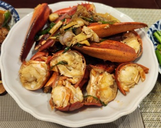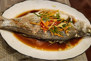 开席时,我没有把菜一次性端上桌。就将它们摆在厨房的岛台,我一道一道端出来,菜在客人间传递。