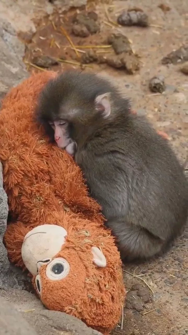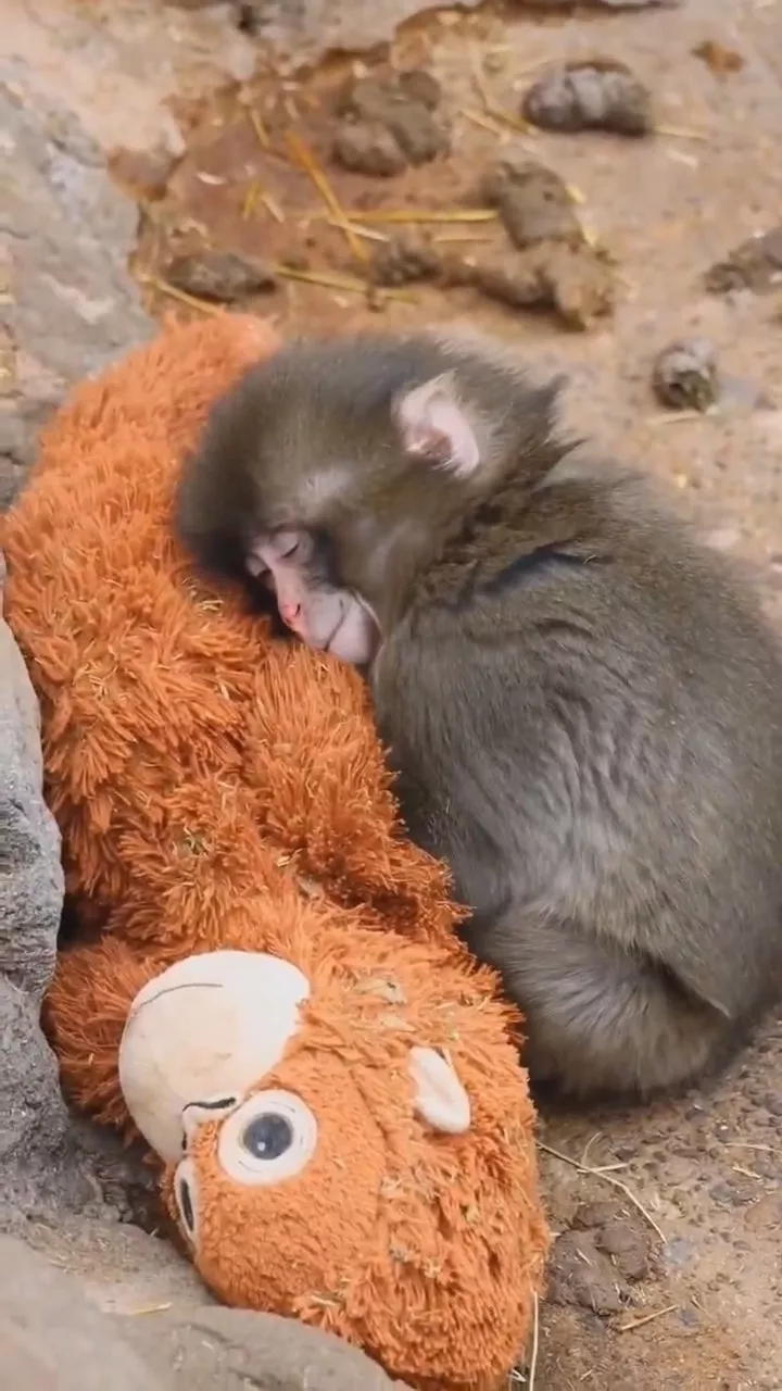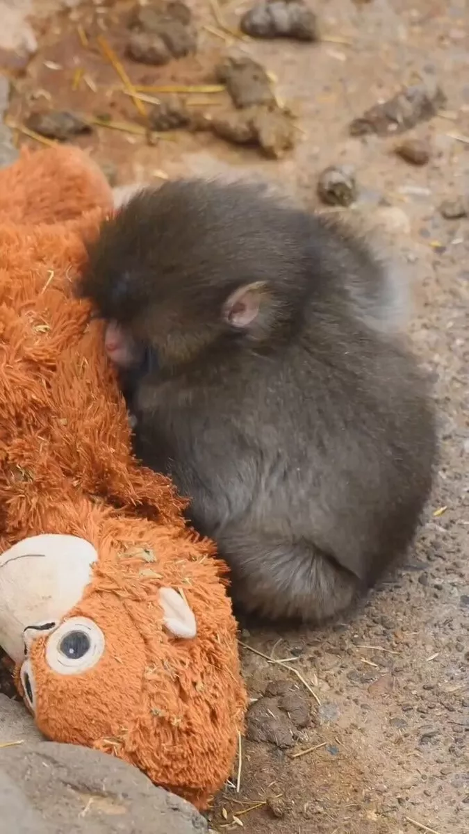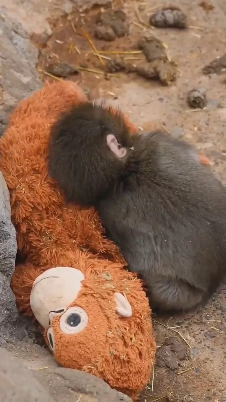 猕猴Panchi把毛公仔当成妈妈,画面温馨