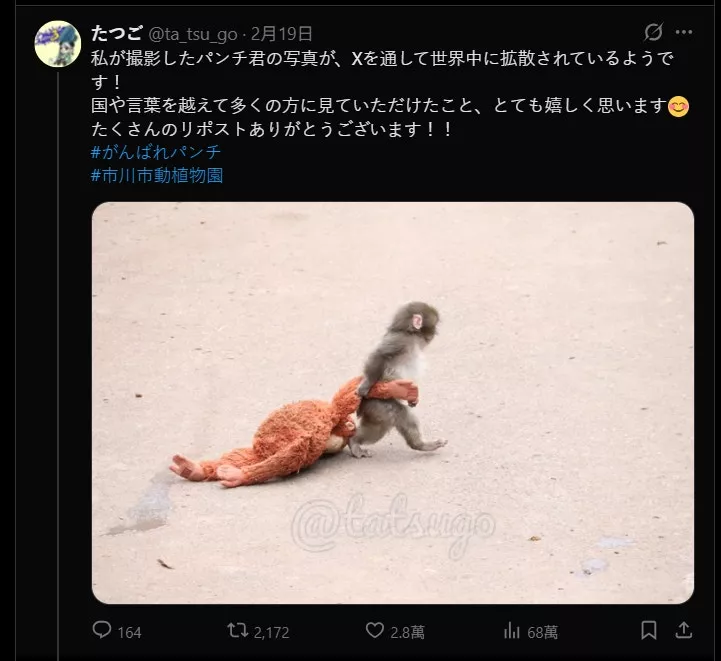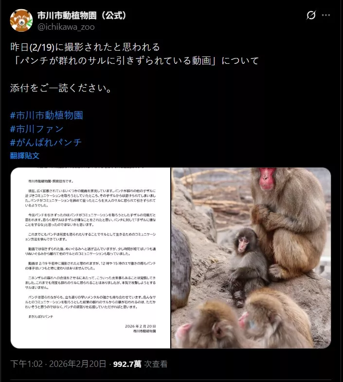 日本6个月大的猕猴Panchi(又名Punch),因为把玩偶当成妈妈而爆红,不仅在日本掀起「社会现象」,让动物园大排长龙,也吸引全球网友关注。近日有网友分享一段影片,画面中Panchi遭其他猴子粗鲁抓起、绕圈拖行,引发外界担忧牠难以融入猴群、甚至遭到「霸凌」。对此,Panchi所在的市川市动物园透过社群媒体发表声明,解释背后原因。