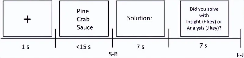 在研究中,团队招募了 299 名大学生参与线上实验,要求他们完成 60 道 CRA 问题(Compound Remote Associates,复合远距联想题)。CRA 是心理学中测量聚合思维(convergent thinking)的经典范式,给你三个看起来毫无关联的词,比如“pine”“crab”“sauce”,要求你找出一个能跟它们分别组成合成词的第四个词,答案是“apple”(pineapple、crabapple、applesauce)。每次答对之后,被试还要报告自己是怎么想到答案的:是通过有意识的逐步分析(analysis),还是答案突然跳进脑子里的顿悟(insight)。