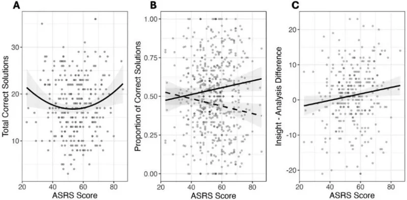Kounios 团队的逻辑是:这个“漏筛”恰好可能让不相关的远距联想更容易进入意识,从而为顿悟创造了条件。他们的回归分析也支持这一点:随着 ASRS 分数升高,被试通过分析解题的比例线性下降(β=−0.12,p =.046),通过顿悟解题的比例线性上升(β=0.11,p=.05)。两条趋势在中间段此消彼长、彼此抵消,正好解释了为什么过去的研究一直没能找到 ADHD 与聚合思维之间的显著相关,因为那些研究只看总正确率,没拆分解题策略。