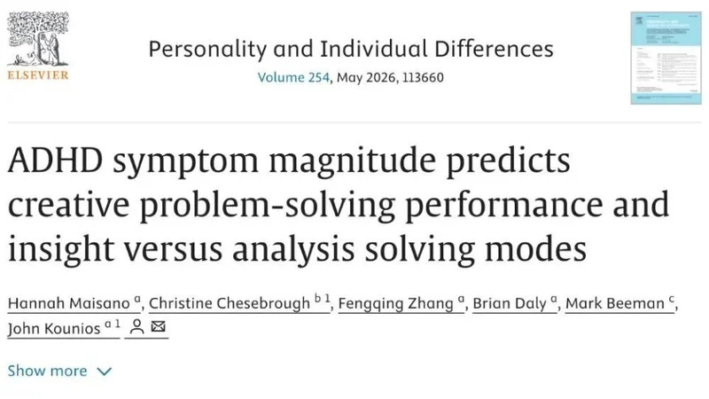最近,一项发表在《人格与个体差异》(Personality and Individual Differences)上的心理学研究在社交媒体上引起了不少关注。美国德雷塞尔大学大学博士生 Hannah Maisano 与 Feinstein 生物医学研究所的 Christine Chesebrough 作为共同第一作者,联合 John Kounios 教授等人报告了一个有些反常识的发现:在一项标准化的创造性问题解决测试中,ADHD(Attention-Deficit/Hyperactivity Disorder,注意缺陷多动障碍)症状最严重的那群人,解题表现比大多数中间水平的人要好。而且他们依赖的路径很特别,不是一步步推理分析,而是那种突然“灵光一闪”的顿悟。