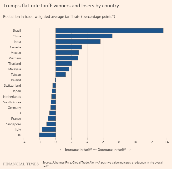美国总统川普推出新的“全球统一关税”方案,并将税率定为15%。独立贸易监测机构的数据显示,在这一新关税框架下,川普此前多次公开点名、言辞严厉批评的国家----包括中国与巴西----反而成为平均关税下降幅度最大的受益者之一;而英国、欧盟、日本等美国长期盟友则将承受更明显的税负上行压力。