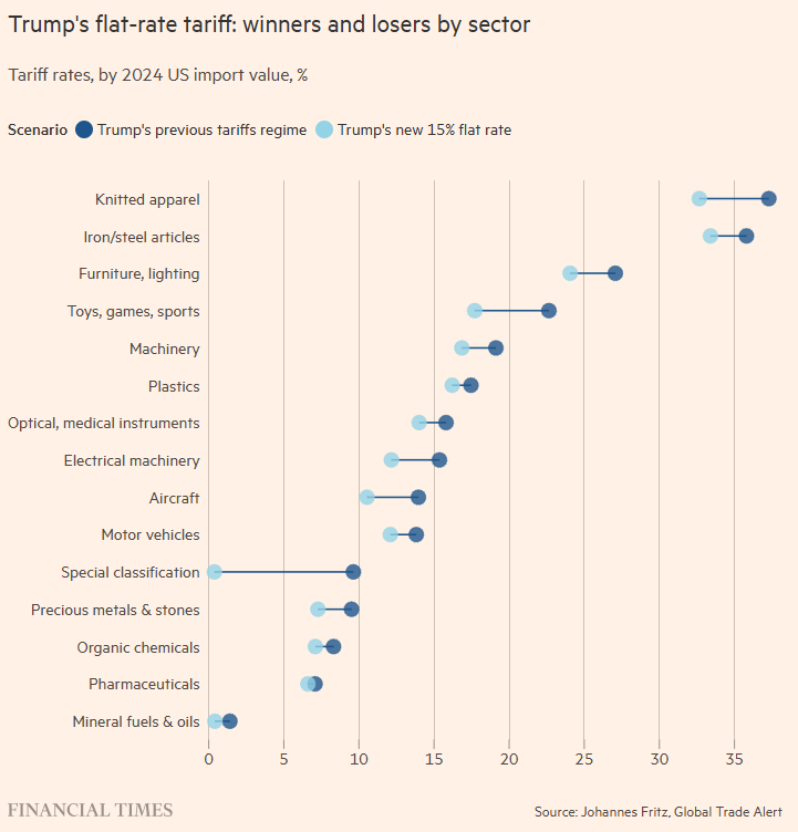GTA测算显示,英国可能成为新制度下的最大受损方:此前英国在许多商品上争取到10%的关税水平,但在统一15%新税率下,其平均关税将上升约2.1个百分点。欧盟方面,尽管其在与华盛顿的安排中获得15%的税率框架,但综合测算仍可能上升约0.8个百分点;在纳入约1100个豁免产品类别后,意大利与法国的暴露程度更高。