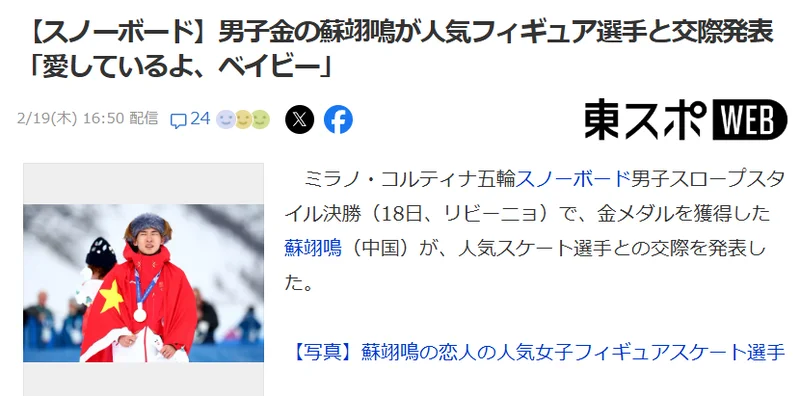 事情迅速被中国媒体捕捉,日本媒体也立刻跟进。日媒在报道中毫不避讳地提到:这是苏翊鸣在夺金之后的公开恋情,是“堂堂正正”的时间点。