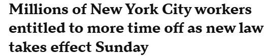 随着一项新法律将于周一生效,数百万纽约市员工将获得额外的休假时间。