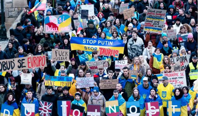 “去你的普京”、“停止帝国主义俄罗斯”,捷克民众拿着反对俄罗斯侵略乌克兰标语,声援乌克兰仍在奋勇抵抗的军民。捷克总统帕维尔特别感谢这些在俄乌战争已经开打4年,仍力挺乌克兰的民众,“我想感谢所有没有因此感到厌倦的人。”