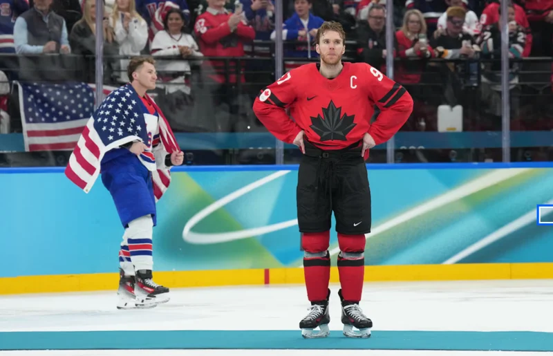 在颁奖仪式开始前,现场观众目睹了极具反差的一幕。美国队员们疯狂拥抱、欢呼,冰场上散落着他们的头盔和球杆。而另一边的加拿大替补席,队员们呆若木鸡,有人用毛巾捂住脸,有人死死盯着冰面,仿佛脚下的冰层正在崩塌。