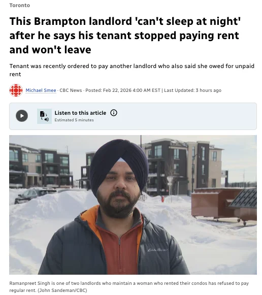 她于2025年4月搬入他位于布兰普顿的一处联排别墅,入住时支付了首月和尾月的房租押金,但此后再未支付过任何房租,并拒绝搬离。
