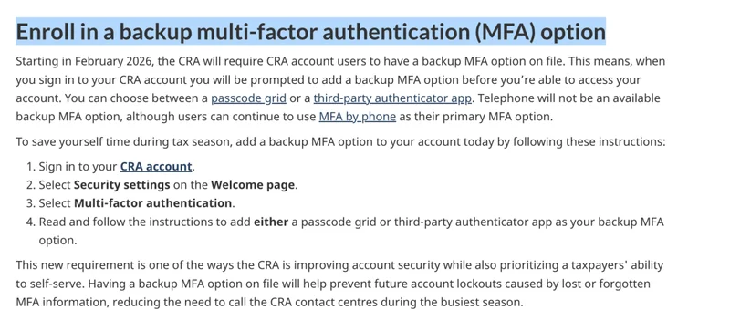 从2026年2月开始,CRA 将要求所有账户用户必须设置一个备用的双重验证(MFA)方式。