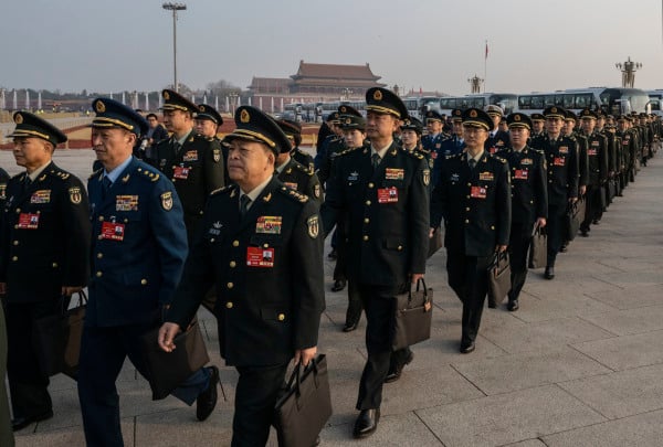 2025年3月8日,中共军队代表在北京人民大会堂出席中共全国人民大会第二次全体会议。(图片来源:Getty Images)