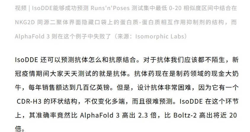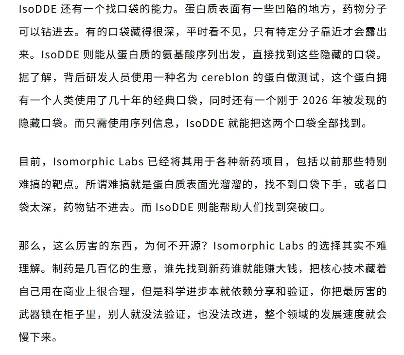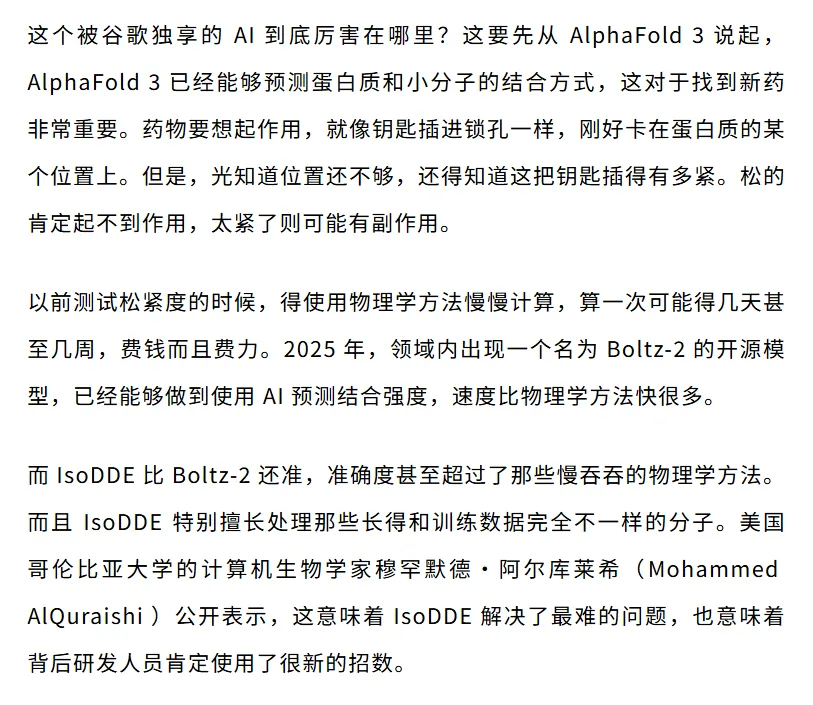 两年前 AlphaFold 3 发布的时候,也是只给了论文没有给代码,被骂了一通之后才开放。这次 IsoDDE 干脆连论文都不发,只给了一份技术报告。但无论如何,IsoDDE 让人们看到了 AI 设计药物的新高度。蛋白质折叠的问题解决之后,下一个问题就是如何设计出来治病的分子。Isomorphic Labs 背后的谷歌显然不想只当一个发论文的,他们也想亲自下场做出能吃的药,以及开辟新的业务增长点。