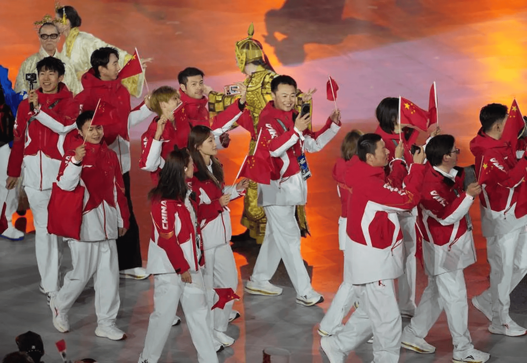 随即,便是各代表团旗手手执各国国旗入场。苏翊鸣作为闭幕式上中国体育代表团的旗手,高举并挥舞着鲜艳的五星红旗入场。在本届冬奥会上,苏翊鸣在自己22岁生日当天夺得单板滑雪男子坡面障碍技巧冠军,为中国代表团赢得在本届赛事的首枚金牌。