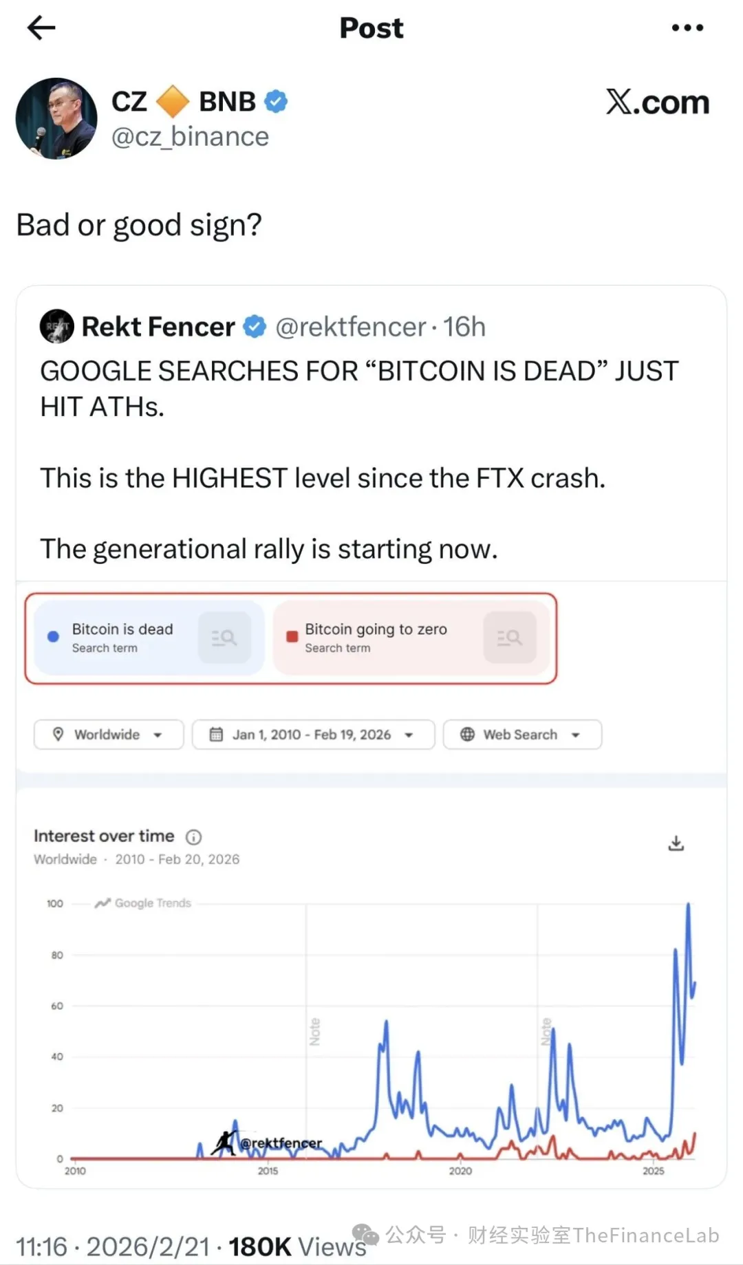 币安创始人赵长鹏在 X 平台转发推文显示,谷歌上关于“比特币已死”的搜索量已创下历史新高。 这是自 FTX 破产引发加密市场崩盘以来的最高水平,分析认为世代更迭之势现在已经开始。 对此赵长鹏回应称“这种情况究竟是好兆头还是坏兆头?”