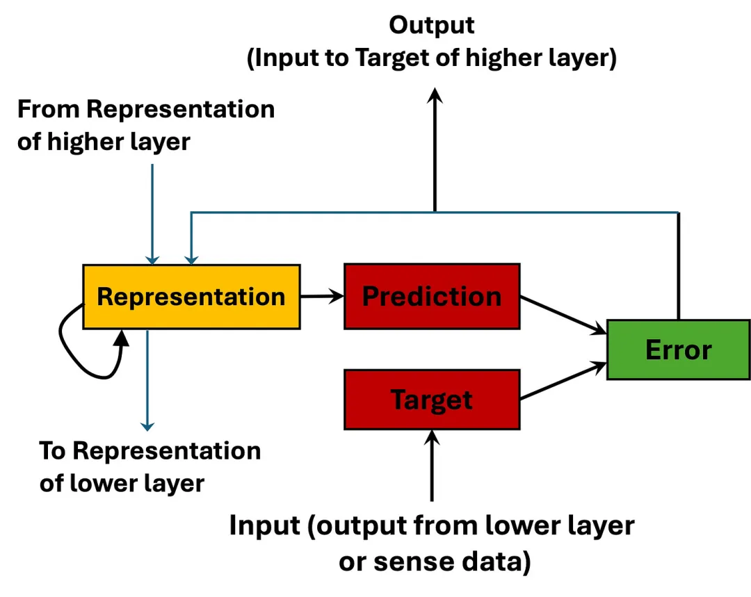 它的每一层包含四个模块:接收输入的目标层(Target)、维护序列记忆的表征层(Representation,使用循环单元)、生成预测的预测层(Prediction),以及比较预测与实际输入的误差层(Error)。预测自上而下流动,误差自下而上传播——正是预测编码的架构。整个网络通过梯度下降和时间反向传播(BPTT)端到端训练。