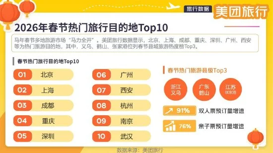 新浪科技讯 2月23日下午消息,美团发布的《2026春节消费洞察报告》显示,受返乡团圆、反向过年等多种出行需求场景激发,北京、上海、成都、重庆、深圳、广州、西安、杭州、南京、武汉为热门旅游目的地Top10。其中,浙江义乌、广东鹤山、江苏张家港位列春节县域旅游热度Top3。
